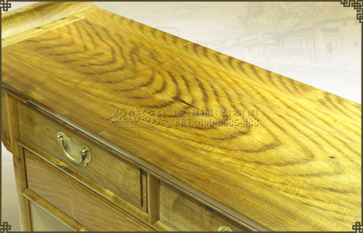 此金絲楠二聯櫥用料十分考究,案面和側板都是有著非常清晰的虎皮紋的金絲楠獨板,是乾隆皇帝最愛的紋理,珍稀罕見,堪稱極品。