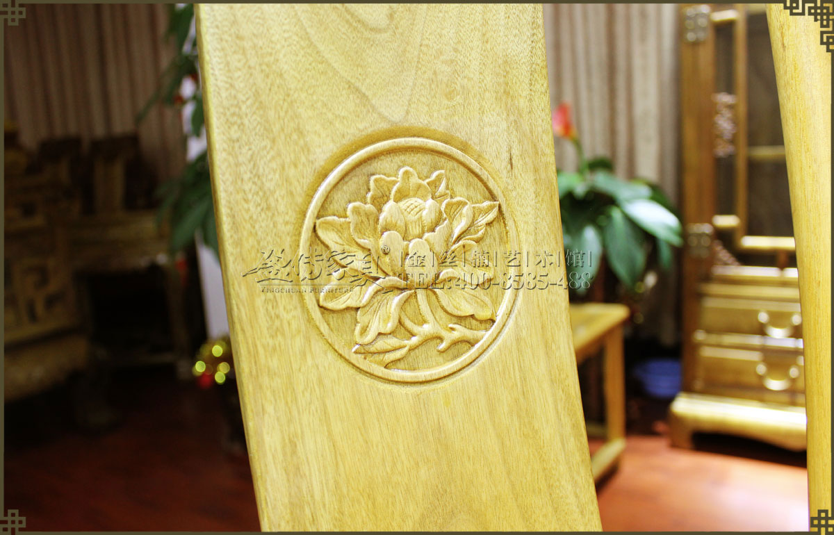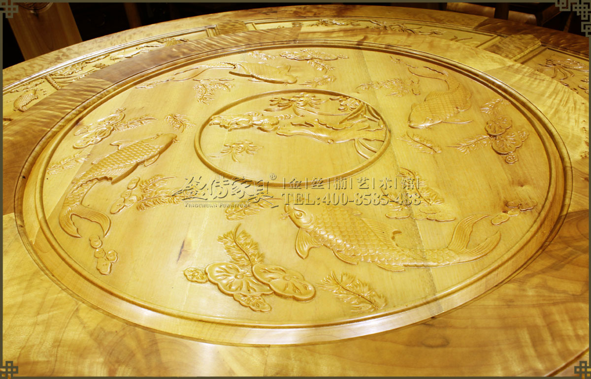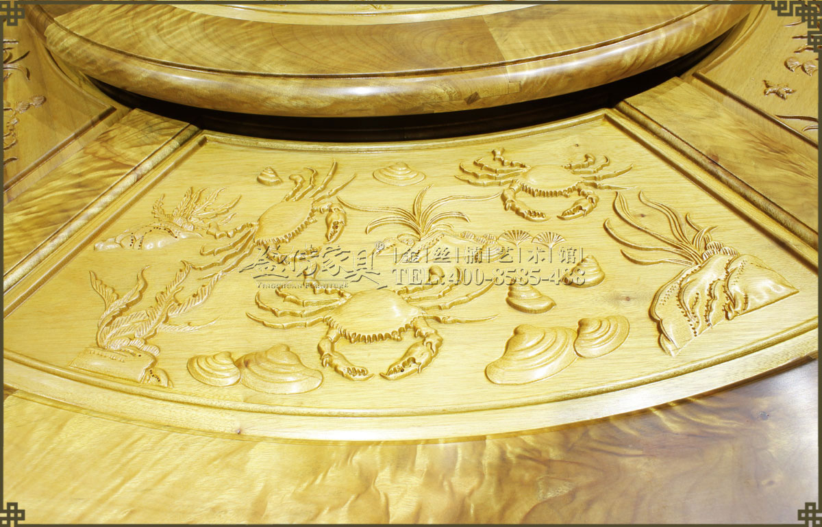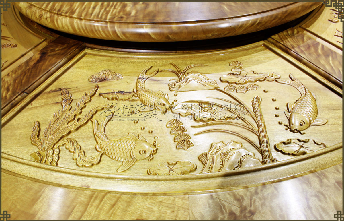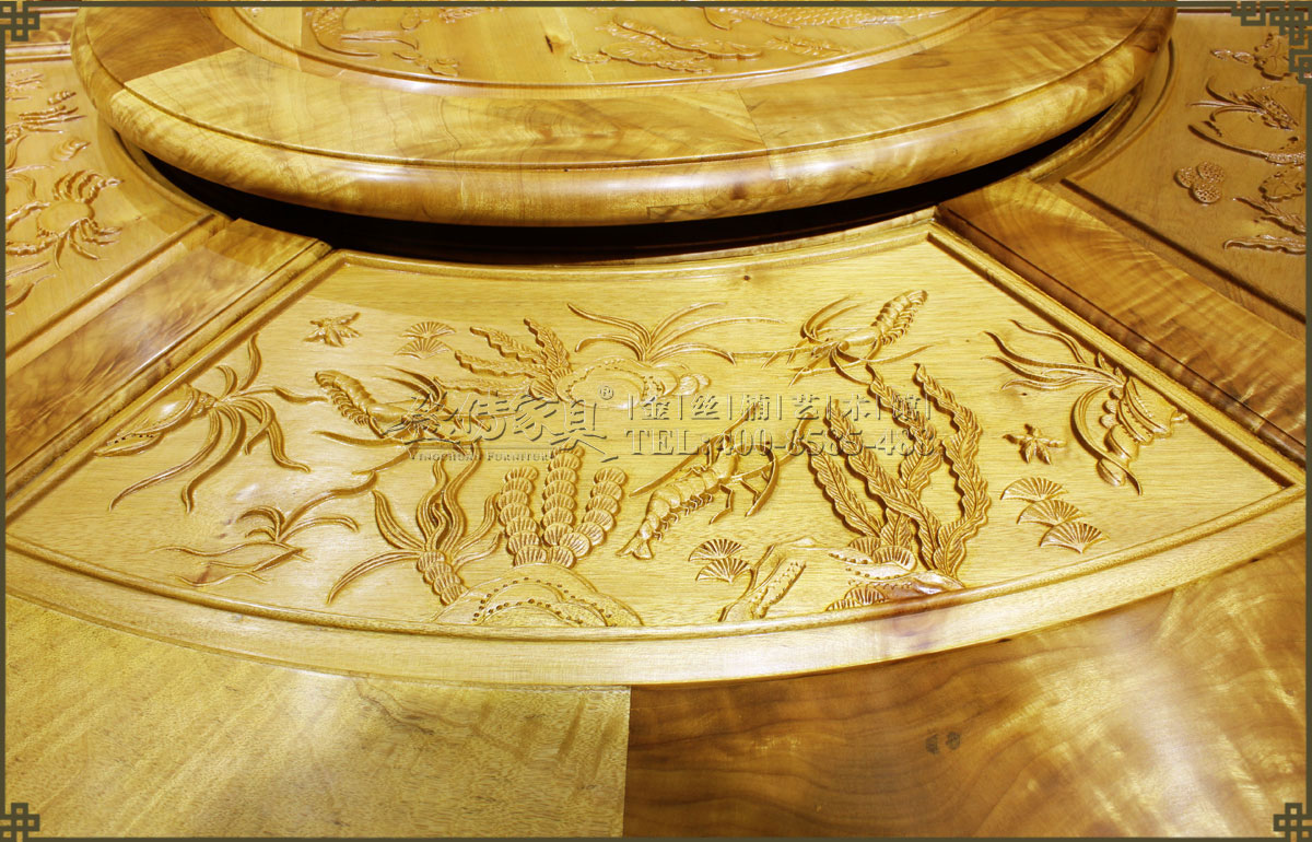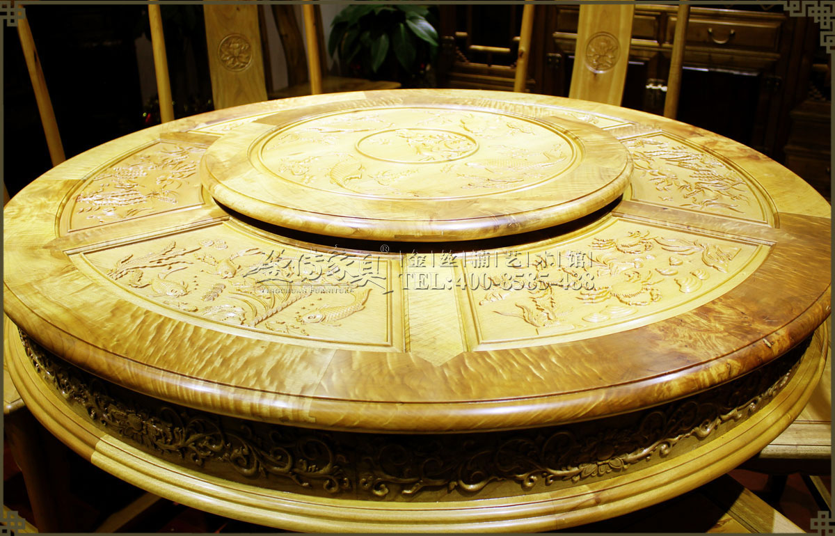一大圓餐臺,配八張椅子。此圓餐臺乃豪華餐廳的高雅之物,極具中國古典特色,線條優美,做工精細,整個臺面、束腰都精雕細刻了美麗的吉祥花紋,高貴、氣派、細膩,雍容絢麗,魅力四射。運用流傳千年的榫卯工藝,環環相扣,是古典家具中的精品之作,有非常高的藝術價值、欣賞價值和收藏價值。