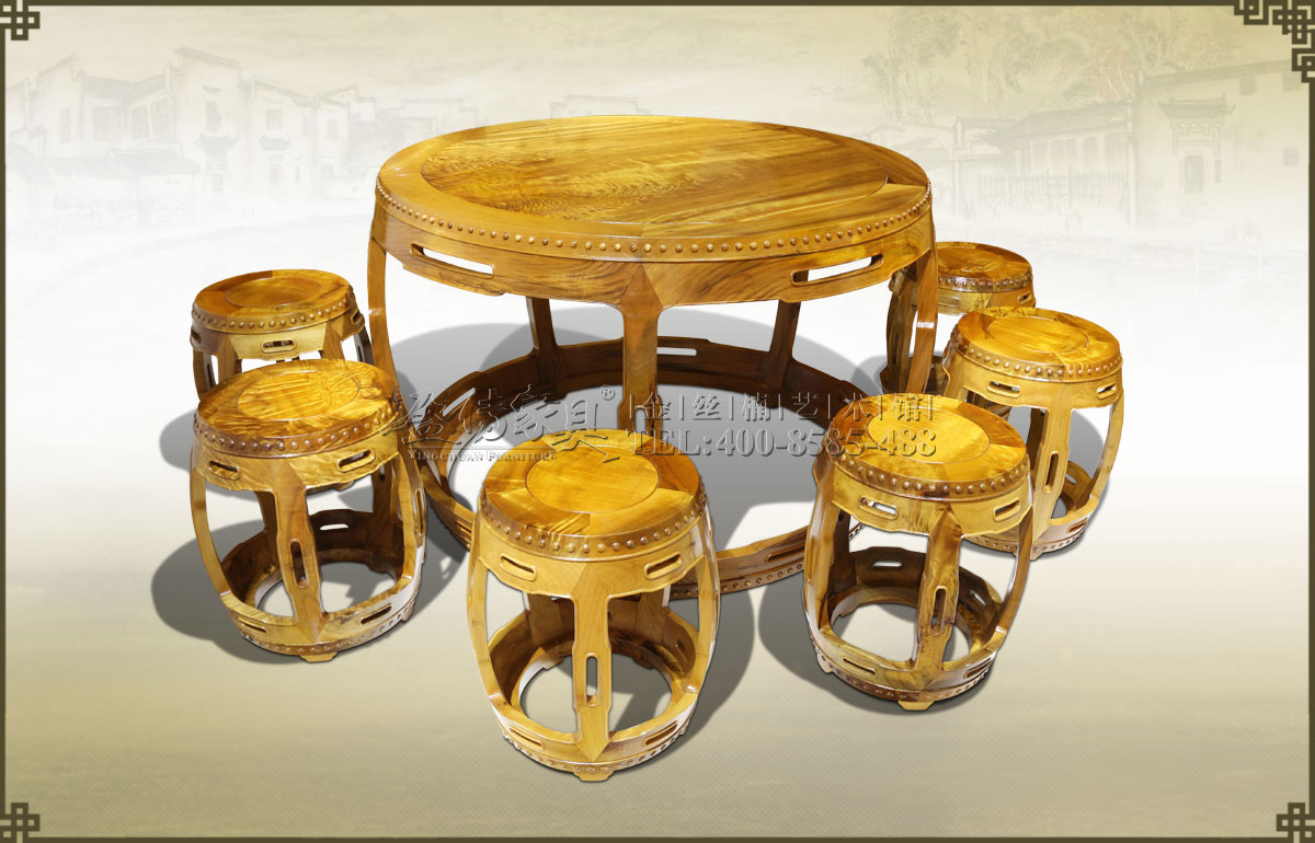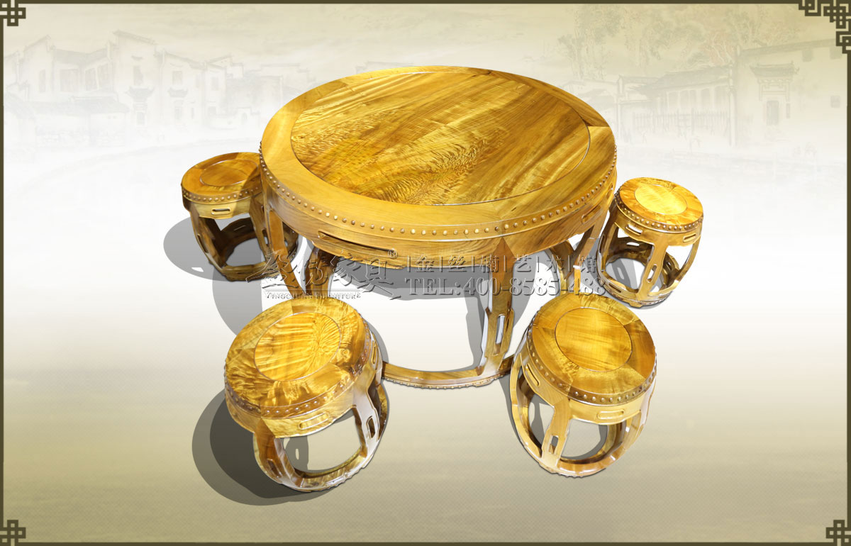 一大圓桌,配6個5開光鼓凳。線條流暢,古色古香,簡潔高雅,在審美情趣上給人以圓融豁達的心態(tài)。在使用上可以多用,兼具餐桌、茶桌、牌桌、洽談桌等多個功能,在這樣高雅的金絲楠圓臺上用餐喝茶,足享人生的快樂。