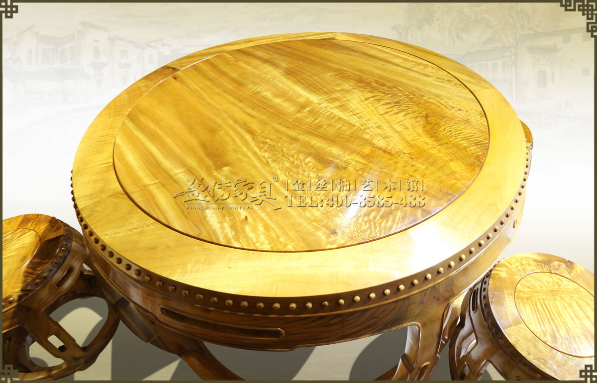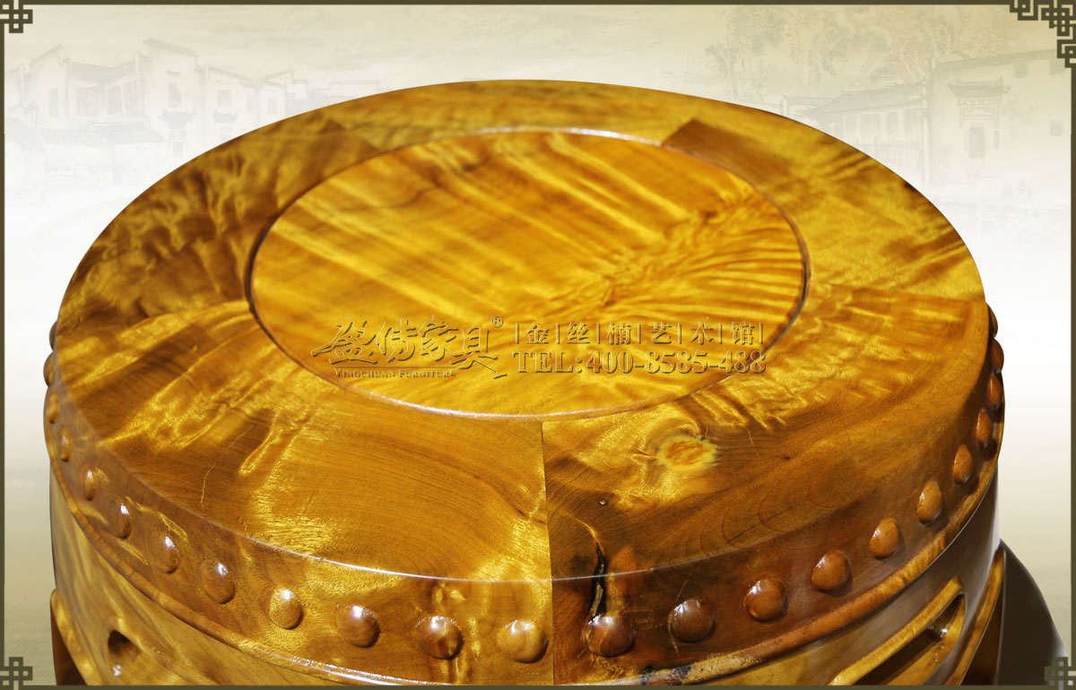 圓桌的面板由兩大塊金絲楠根料獨板制作而成,最長處分別為53cm和48cm,如此大的根料獨板極其少見。上面布滿天然水波紋,眩美獨特,猶如一幅藝術(shù)畫,震撼人心。5張鼓凳也是使用金絲楠根料制作而成,質(zhì)量上乘,品質(zhì)感強,紋理清晰美麗,猶如藝術(shù)品一般。